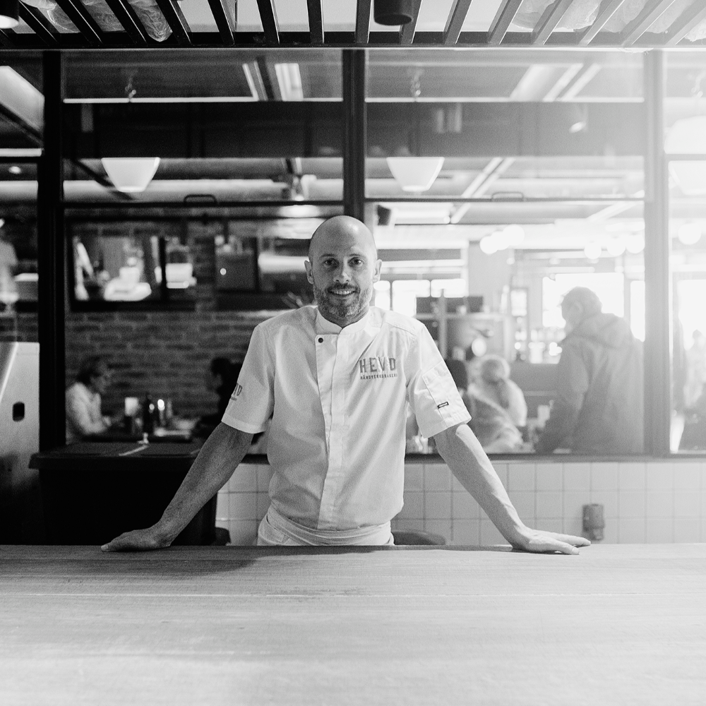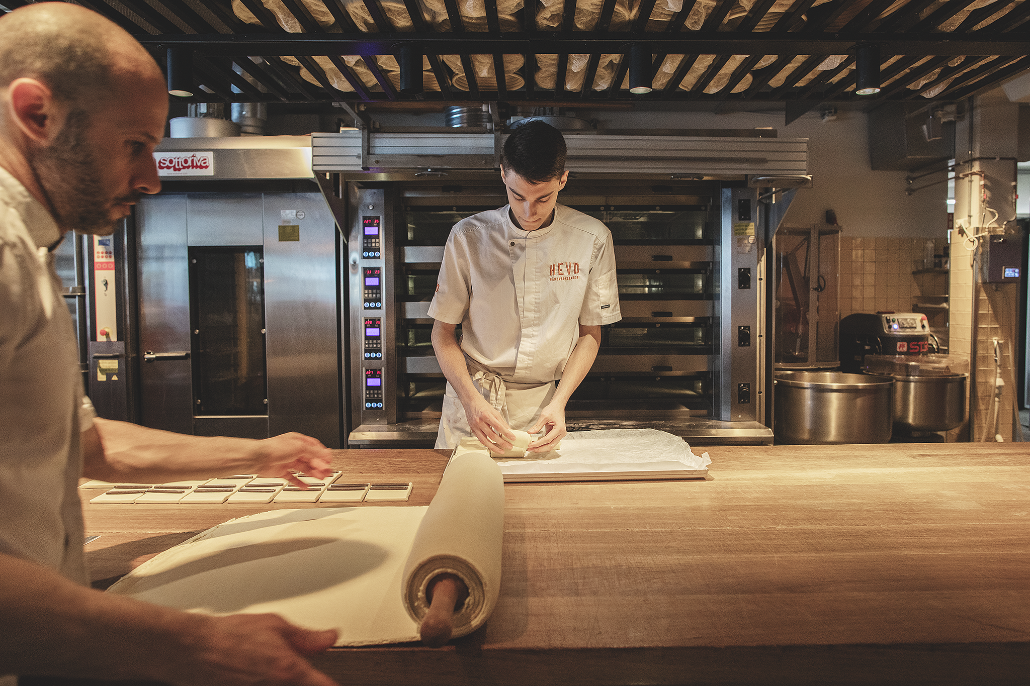 Setter du pris på godt mathåndverk, bør du sikre deg bord nær det åpne bakeriet inne på Hevd. Hver morgen samles bakerne rundt det store bakebordet, hvor raske, erfarne hender arbeider med deigene og former landbrød, rugbrød, olivenbrød, croissanter, rundstykker og alt det andre nybakte du finner i hyllene.